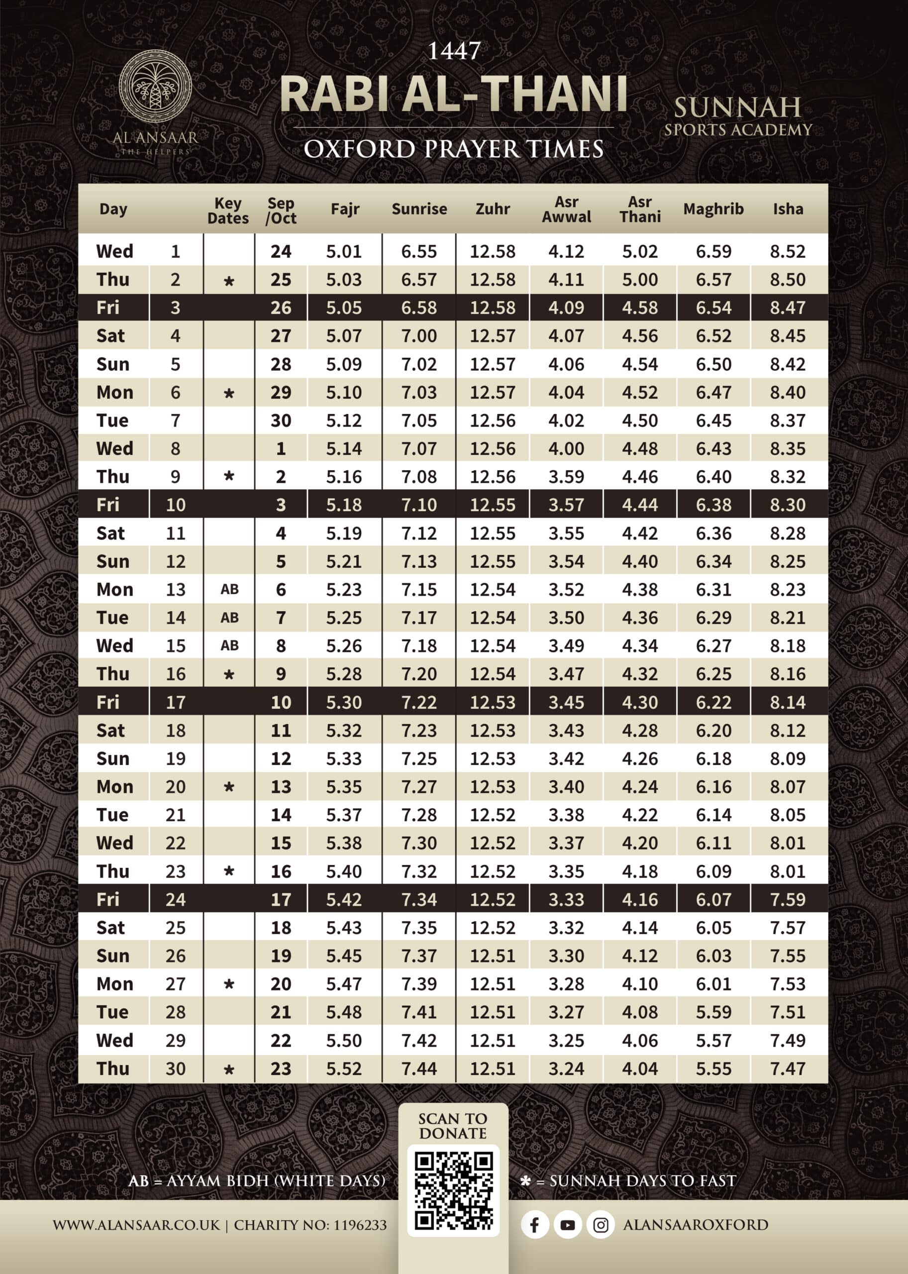 Al Ansaar presents monthly prayer times which it intends to revive key dates for the month.