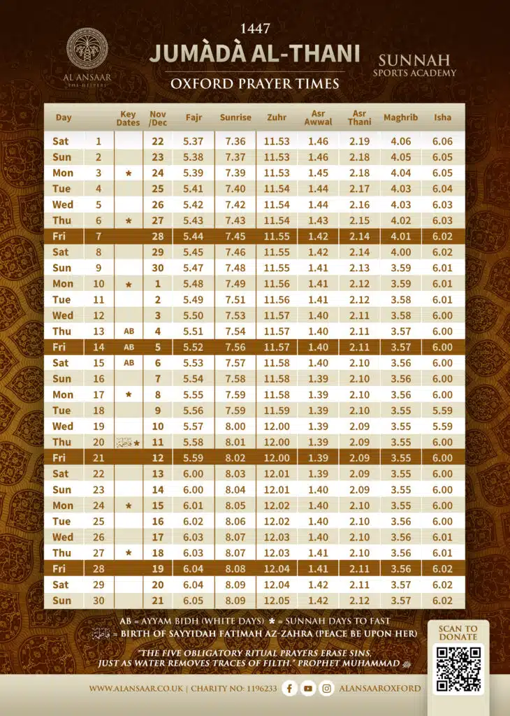 Al Ansaar presents monthly prayer times which it intends to revive key dates for the month.